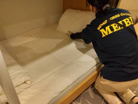 停泊中の船内客室清掃です。分担制で難しい作業はありません。